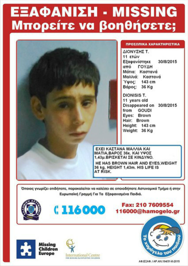Σύμφωνα με «το Χαμόγελο του παιδιού», λόγω των ιδιαίτερων συνθηκών της εξαφάνισης του Διονύση Τ. κρίνεται επιτακτική η άμεση εύρεσή του.