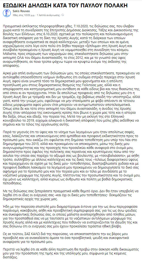 Από τη μεριά του, ο Σάκης Ρουβάς σε ανάρτησή του στο Facebook αναφέρει: