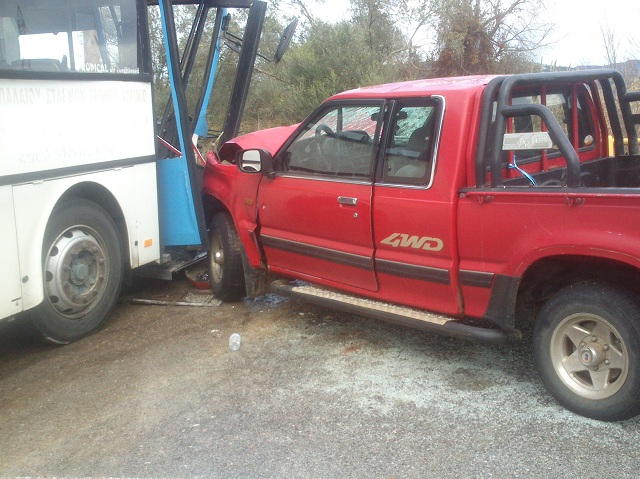 Από τη σφοδρή σύγκρουση τραυματίστηκαν δύο άτομα τα οποία επέβαιναν στο αγροτικό, ενώ στο νοσοκομείο μεταφέρθηκε και ο οδηγός του λεωφορείου, για προληπτικούς λόγους.