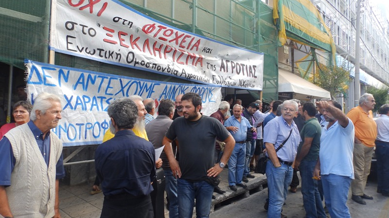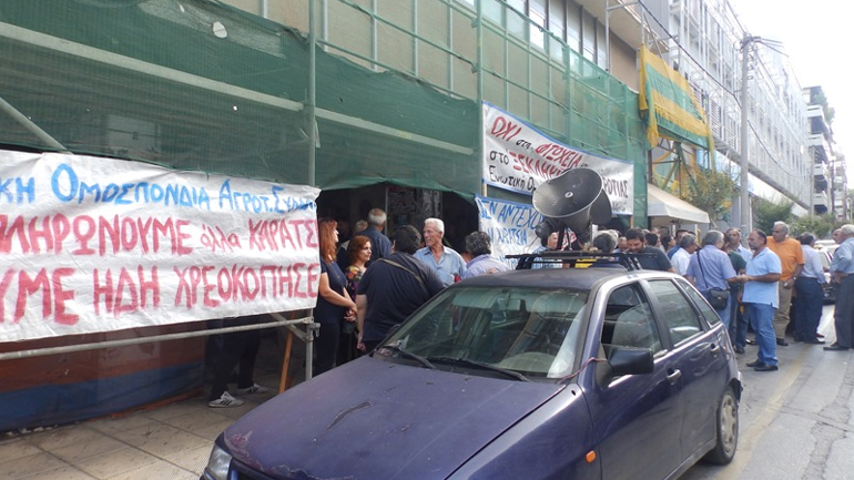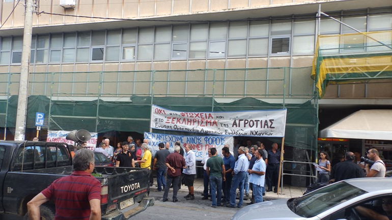 Αγρότες και κτηνοτρόφοι μέλη της Ενωτικής Ομοσπονδίας Αγροτών που πρόσκεινται στο ΚΚΕ τοποθέτησαν λίγο μετά τις 11.00 το πρωί δύο πανό στην είσοδο του κτηρίου αποκλείοντας την είσοδο ενώ μοίραζαν και φυλλάδια σε πολίτες.