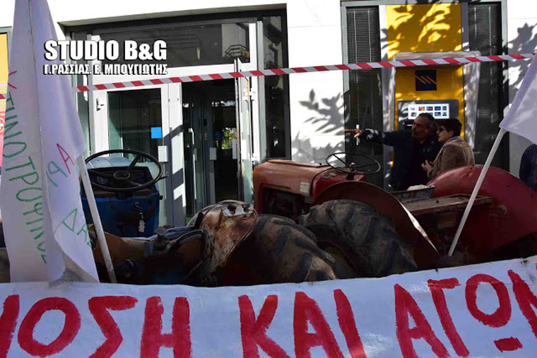 Αγρότες και κτηνοτρόφοι από το μπλόκο της Δαλαμανάρας προχώρησαν σήμερα στον αποκλεισμό της εισόδου της Τράπεζας Πειραιώς με τα τρακτέρ τους, στην πόλη του Άργους.