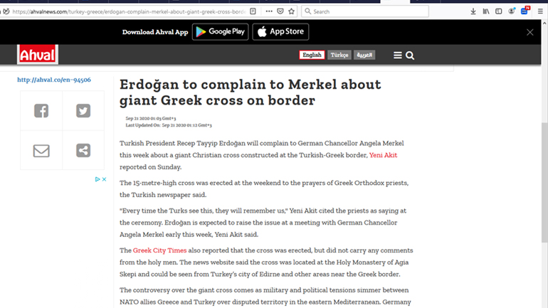 Από την άλλη πλευρά στο δημοσίευμα υπογραμμίζεται ότι και οι Greek City Times μετέδωσαν την είδηση, διαψεύδοντας ωστόσο τα εν λόγω σχόλια από τους ιερείς. Ο ιστότοπος ανέφερε επίσης, ότι ο σταυρός βρισκόταν στην Ιερά Μονή της Αγίας Σκέπης και είναι ορατός από την πόλη της Τουρκίας, την Εδιρνή και άλλες περιοχές κοντά στα ελληνικά σύνορα.