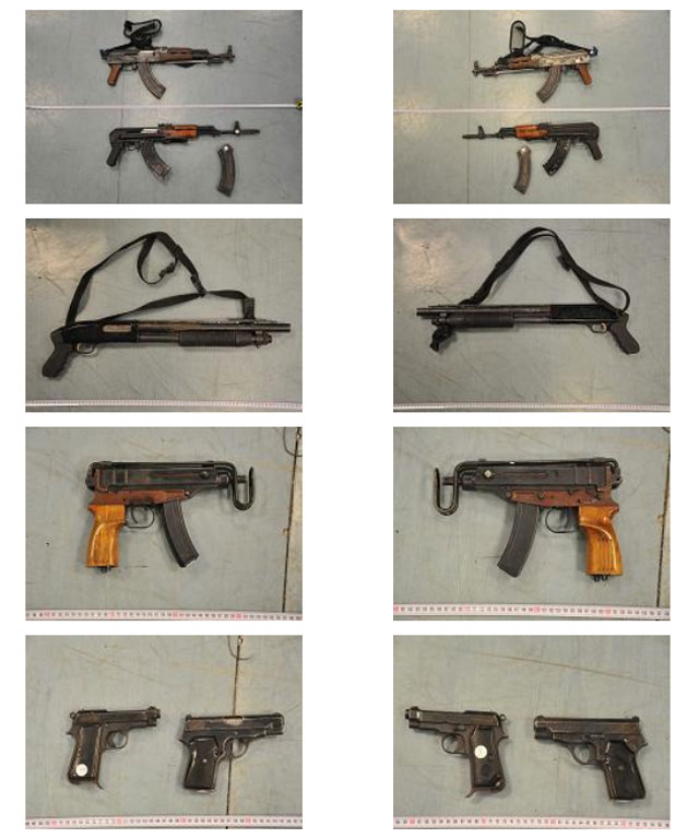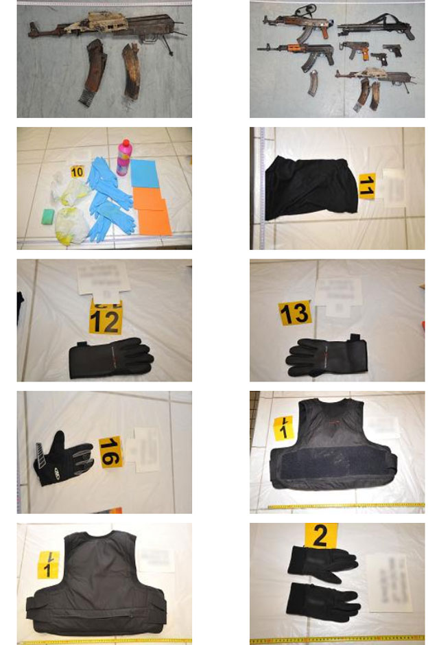 – τρία πολεμικά τυφέκια τύπου Kalashnikov (το ένα φέρει εμφανή σημάδια-φθορές από πυρκαγιά που έβαλε ο δράστης στο όχημα τύπου «κλούβα» που προσομοίαζε με ασθενοφόρο)