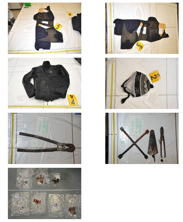 – αλεξίσφαιρα γιλέκα, σφαίρες, φυσίγγια, γάντια, υλικά καθαρισμού, εργαλεία και άλλα αντικείμενα.