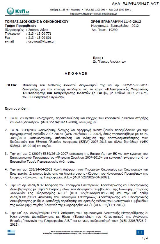 Υπενθυμίζεται ότι στις 21 Αυγούστου του 2012 ο υπουργός Προστασίας του Πολίτη είχε αιτηθεί με επιστολή του προς τον διευθύνοντα σύμβουλο της Κοινωνίας της Πληροφορίας, κ. Γιώργο Καλαμαρά, τη ματαίωση του διαγωνισμού.