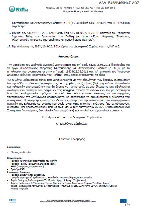Με απόφαση, με αριθμό πρωτοκόλλου 19290, το Διοικητικό Συμβούλιο της ΚτΠ αποφάσισε την ακύρωση του διαγωνισμού. Στο αιτιολογικό της απόφασης επισημαίνεται ότι ο συγκεκριμένος μαθηματικός τύπος ο οποίος χρησιμοποιήθηκε για την αξιολόγηση των δοκιμών συστημάτων δεν προσέδιδε τη δέουσα βαρύτητα στις αποτυχημένες αναζητήσεις. Το αποτέλεσμα, σύμφωνα με την απόφαση, ήταν «να μην αξιολογούνται δεόντως οι αποτυχημένες ταυτοποιήσεις στα λανθάνοντα αποτυπώματα, με αποτέλεσμα να αμφισβητείται η αξιοπιστία του συστήματος. Η παράμετρος αυτή είναι ιδιαιτέρως κρίσιμη για την ικανοποίηση των επιχειρησιακών αναγκών της Ελληνικής Αστυνομίας, που συνίστανται στην απόκτηση ενός συστήματος σύγχρονου, αξιόπιστου και αποτελεσματικού που θα είναι ισάξιο των συστημάτων ΑFIS των υπόλοιπων ευρωπαϊκών κρατών».