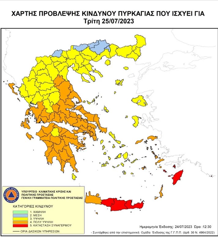 Ακραίος κίνδυνος πυρκαγιάς – Κατάσταση συναγερμού (κατηγορία κινδύνου 5) προβλέπεται σήμερα για δύο περιφέρειες της χώρας, ενώ πολύ υψηλός κίνδυνος πυρκαγιάς (κατηγορία κινδύνου 4) για εννέα περιφέρειες, σύμφωνα με τον Χάρτη Πρόβλεψης Κινδύνου Πυρκαγιάς που εκδίδει η γενική γραμματεία Πολιτικής Προστασίας του υπουργείου Κλιματικής Κρίσης & Πολιτικής Προστασίας (civilprotection.gov.gr).