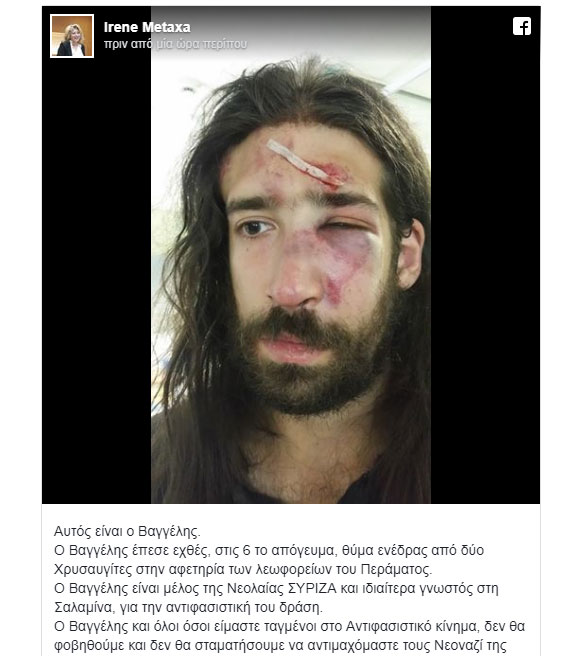Σήμερα Κυριακή η περιφερειακή σύμβουλος Αττικής Ειρήνη Μεταξά, στον προσωπικό της λογαριασμό στο facebook δίνει λεπτομέρειες για το περιστατικό, καθώς ο Βαγγέλης, ο νεαρός που δέχτηκε την άνανδρη επίθεση, είναι γνωστός για την αντιφασιστική του δράση.