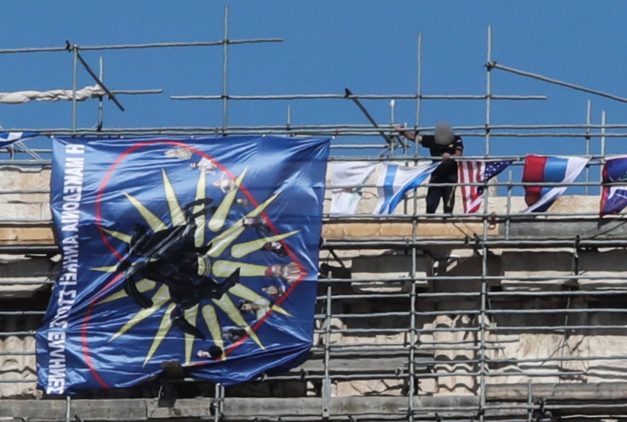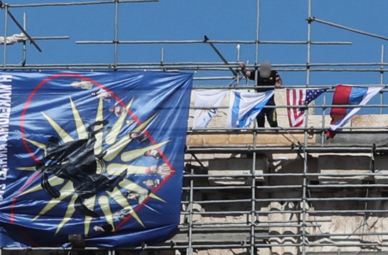 Συγκεκριμένα, στις 10 το πρωί της Κυριακής ένας άνδρας σκαρφάλωσε στην σκαλωσιά για τα έργα συντήρησης και κρέμασε πάνω σ’ αυτή, σημαίες της Ελλάδας, του Ισραήλ, της Νέας Δημοκρατίας και μια ακόμη με το αστέρι της Βεργίνας.