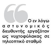 Στα χέρια των ανδρών της Διεύθυνσης Εσωτερικών Υποθέσεων της ΕΛ.ΑΣ. έπεσε χθες ο αστυνομικός διευθυντής Αναστάσιος Ρ., καθώς, όπως διαπιστώθηκε, παράλληλα με τα αστυνομικά του καθήκοντα εκτελούσε και χρέη… νυχτοφύλακα στον τηλεοπτικό σταθμό Blue Sky.