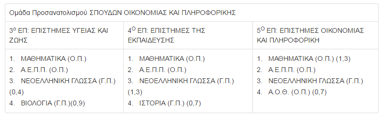 Οι υποψήφιοι εκτός από τα ανωτέρω τρία κοινά μαθήματα θα πρέπει να εξεταστούν: α) στη Βιολογία Γενικής Παιδείας, για να έχουν πρόσβαση στο 3ο Επιστημονικό Πεδίο β) στην Ιστορία Γενικής Παιδείας, για να έχουν πρόσβαση στο 4ο Επιστημονικό Πεδίο γ) στις Αρχές Οικονομικής Θεωρίας (ΑΟΘ) Ομάδας Προσανατολισμού, για να έχουν πρόσβαση στο 5ο Επιστημονικό Πεδίο.