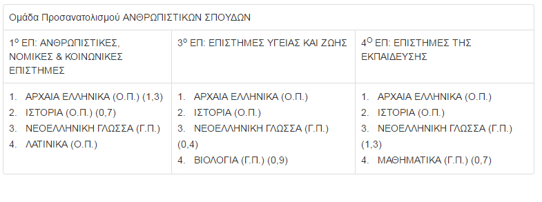 Οι υποψήφιοι εκτός από τα ανωτέρω τρία κοινά μαθήματα θα πρέπει να εξεταστούν: α) στα Λατινικά Ομάδας Προσανατολισμού, για να έχουν πρόσβαση στο 1ο Επιστημονικό Πεδίο β) στη Βιολογία Γενικής Παιδείας, για να έχουν πρόσβαση στο 3ο Επιστημονικό Πεδίο γ) στα Μαθηματικά Γενικής Παιδείας, για να έχουν πρόσβαση στο 4ο Επιστημονικό Πεδίο. Επισημαίνεται ότι οι υποψήφιοι μπορούν να επιλέξουν μέχρι δύο (2) Επιστημονικά Πεδία. Ειδικότερα, οι εναλλακτικοί συνδυασμοί πανελλαδικώς εξεταζομένων μαθημάτων της Ομάδας Προσανατολισμού Ανθρωπιστικών Σπουδών ανά Επιστημονικό Πεδίο και οι συντελεστές βαρύτητας των δύο μαθημάτων παρουσιάζονται στον παρακάτω πίνακα: