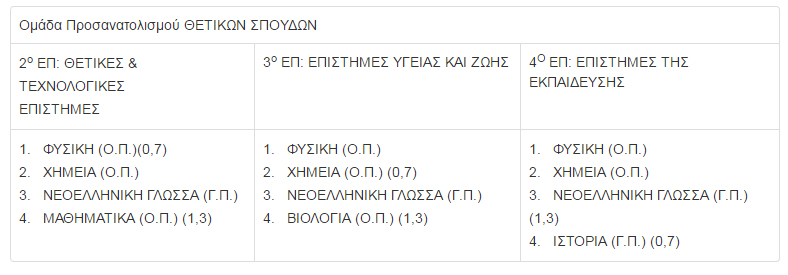 Οι υποψήφιοι εκτός από τα ανωτέρω τρία κοινά μαθήματα θα πρέπει να εξεταστούν: α) στα Μαθηματικά Ομάδας Προσανατολισμού, για να έχουν πρόσβαση στο 2ο Επιστημονικό Πεδίο β) στη Βιολογία Ομάδας Προσανατολισμού, για να έχουν πρόσβαση στο 3ο Επιστημονικό Πεδίο γ) στην Ιστορία Γενικής Παιδείας, για να έχουν πρόσβαση στο 4ο Επιστημονικό Πεδίο. Επισημαίνεται ότι οι υποψήφιοι μπορούν να επιλέξουν μέχρι δύο (2) Επιστημονικά Πεδία. Ειδικότερα οι εναλλακτικοί συνδυασμοί πανελλαδικώς εξεταζομένων μαθημάτων της Ομάδας Προσανατολισμού Θετικών Σπουδών ανά Επιστημονικό Πεδίο και οι συντελεστές βαρύτητας των δύο μαθημάτων παρουσιάζονται στον παρακάτω πίνακα: