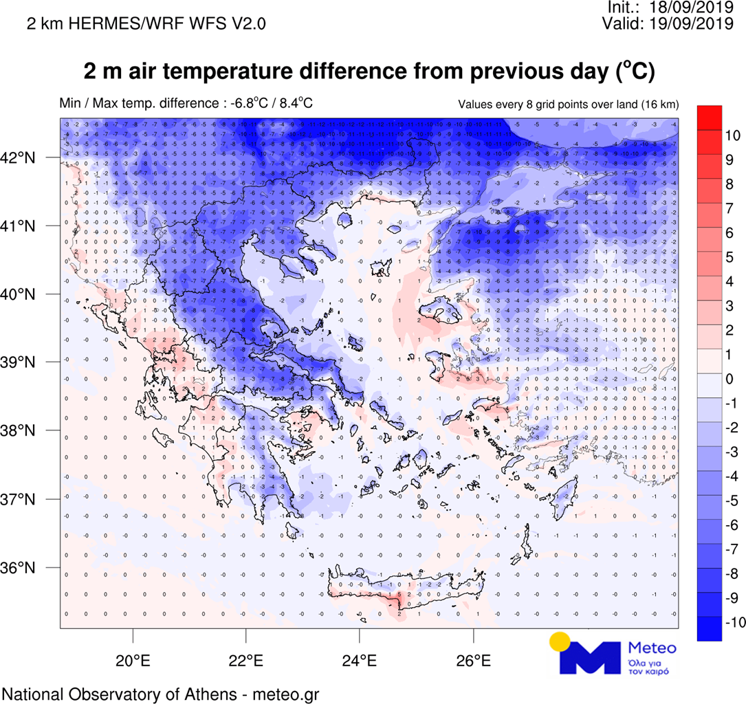 Όπως εύκολα μπορεί να παρατηρηθεί, πτώση της θερμοκρασίας άνω των 5°C αναμένουμε στη βόρεια και ανατολική ηπειρωτική χώρα, ενώ στη Δυτική Ελλάδα και τα νησιά του Αιγαίου η θερμοκρασία δεν θα μεταβληθεί σημαντικά πριν την Παρασκευή.