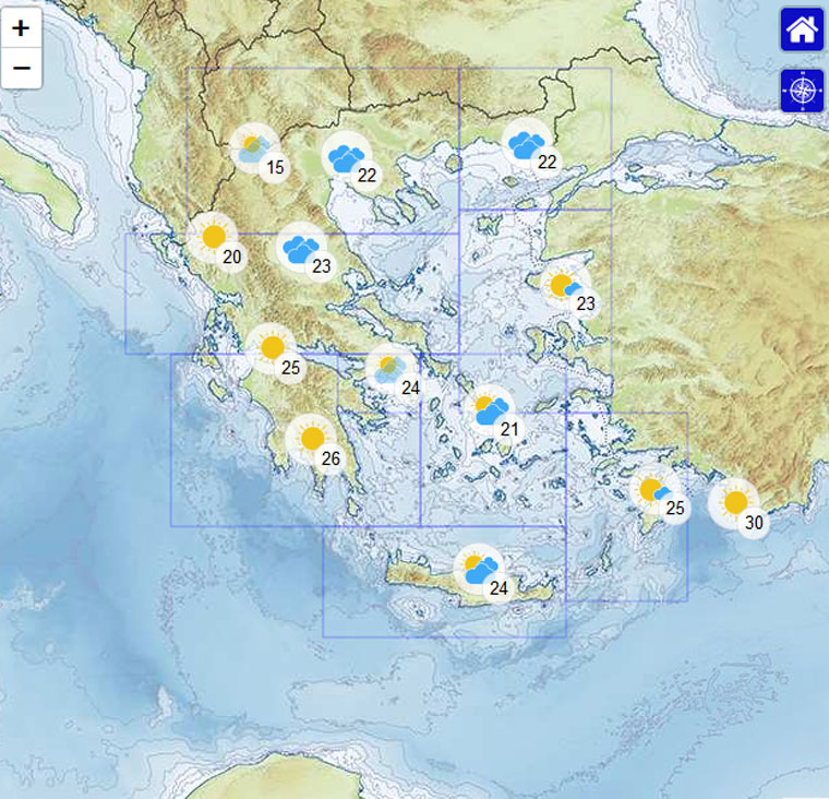Θερμοκρασία: Από 22 έως 26 και στη νότια Κρήτη έως 29 βαθμούς Κελσίου.