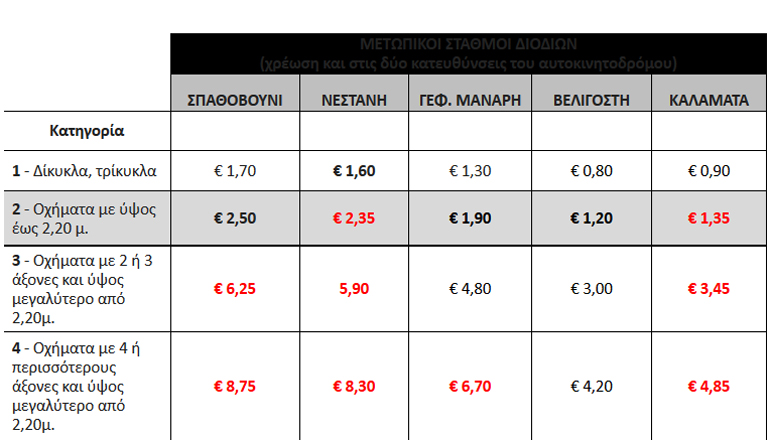 Με βάση τα προβλεπόμενα από τη Σύμβαση Παραχώρησης του Έργου «Μελέτη, Κατασκευή, Χρηματοδότηση, Λειτουργία, Συντήρηση και Εκμετάλλευση του αυτοκινητόδρομου Κόρινθος – Τρίπολη – Καλαμάτα και κλάδος Λεύκτρο – Σπάρτη» (νόμος 3559/2007), από τα μεσάνυχτα της Πέμπτης 31 Δεκεμβρίου 2015 προς Παρασκευή 1 Ιανουαρίου 2016 (ώρα 00:00 της 1/1/2016), οι χρεώσεις στους σταθμούς διοδίων του αυτοκινητοδρόμου αναπροσαρμόζονται τιμαριθμικά για το έτος 2016.