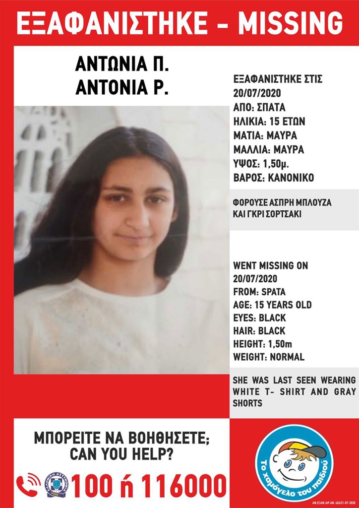 Η 15χρονη Αντωνία Π. εξαφανίστηκε στις 20/07/2020 και ώρα 16:00, από τα Σπάτα Αττικής. Έχει ύψος 1.50 μ. και κανονικό βάρος. Έχει μαύρα μαλλιά και μαύρα μάτια. Την ημέρα που εξαφανίστηκε φορούσε άσπρη μπλούζα και γκρι σορτσάκι.