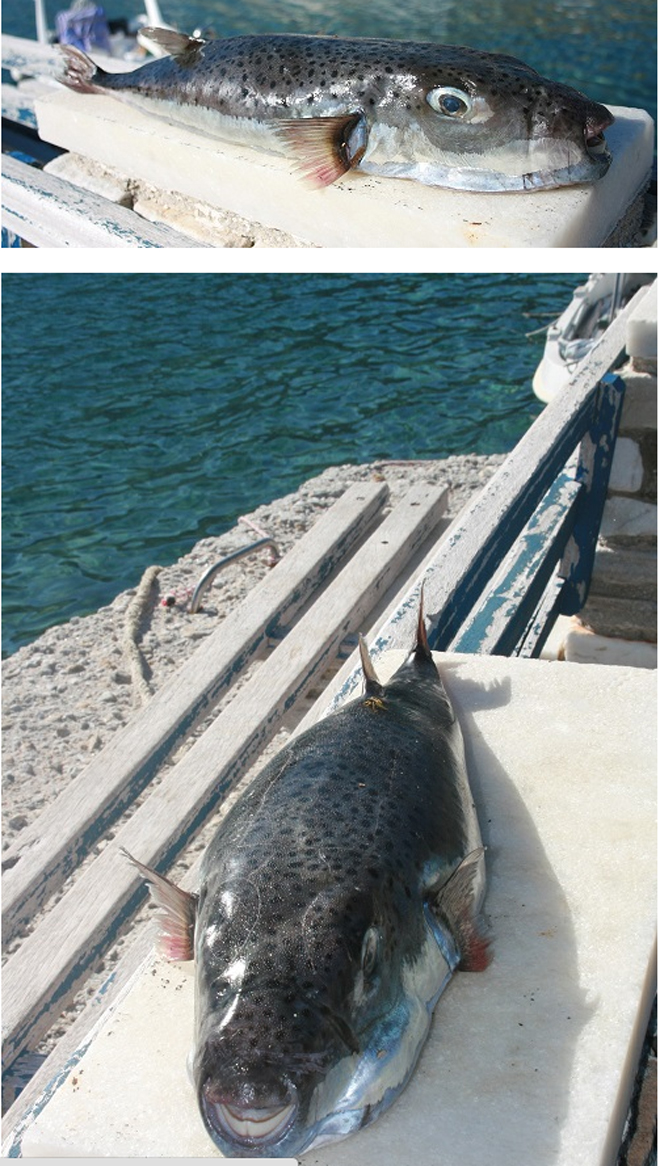 Αλιέας βρήκε στα δίχτυα του έναν λαγοκέφαλο (Lagocephalus sceleratus), βάρους 3,2 kg και μήκους 40 εκ. Να σημειωθεί ότι στα νερά του παραλιακού οικισμού του Απόλλωνα Νάξου δεν αλιεύονται ψάρια τέτοιου είδους.