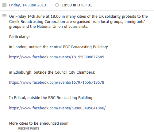 Σε τρεις πόλεις των Ηνωμένου Βασιλείου θα διεξαχθούν συγκεντρώσεις αλληλεγγύης για το κλείσιμο της ΕΡΤ. Όπως ανακοινώθηκε από το Facebook την Παρασκευή στις 18.00, τοπική ώρα, οι αλληλέγγυοι θα συγκεντρωθούν στο Λονδίνο (έξω από το κτίριο του BBC), το Εδιμβούργο (έξω από την αίθουσα του δημοτικού συμβουλίου) και το Μπρίστολ (έξω από το κτίριο του BBC).