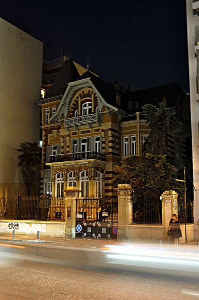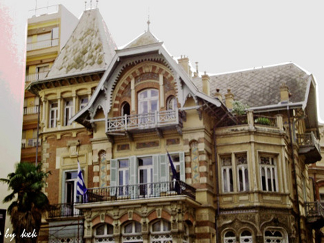 Το μπεζ κόκκινο αρχοντικό (η πρόσοψη είναι καλυμμένη με τουβλάκια) της Βασιλίσσης Ολγας (αριθμός 105) είναι τριώροφο και κάθε ένας από τους ορόφους αυτούς αποτελεί ξεχωριστά διαμερίσματα. Χαρακτηριστικά του στοιχεία είναι η ασυμμετρία της κάτοψης, οι όγκοι του κλιμακοστασίου που προεξέχουν από τον κύριο όγκο του κτιρίου με τη μορφή πύργου και η ξύλινη στέγη. Την εντυπωσιακή του όψη συμπληρώνει το πλήθος των στεγασμένων και ελεύθερων εξωστών αλλά και εντυπωσιακά τζαμωτά.