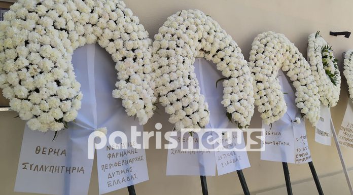 Πολλά και τα στεφάνια έξω από τον ιερό ναό, μεταξύ των οποίων, ξεχώρισαν αυτό της συζύγου του, που δεν μπόρεσε να τον «αποχαιρετήσει» λόγω της νοσηλείας της και των παιδιών του, του Περιφερειάρχη Δυτ. Ελλάδας κ. Νεκτάριου Φαρμάκη, του Περιφερειακού Συμβουλίου Δυτ. Ελλάδας, της προέδρου του ΚΙΝ. ΑΛ. κας Φώφης Γεννημάτα και του προέδρου και του Δ.Σ. της Ένωσης Περιφερειών Ελλάδας.