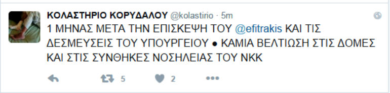 Σύμφωνα με ανάρτηση στον λογαριασμό που έχουν δημιουργήσει στο Twitter αλληλέγγυοι των νοσηλευομένων, παρά τις δεσμεύσεις του υπουργείου, δεν έχει σημειωθεί καμία βελτίωση στις δομές και τις συνθήκες νοσηλείας των κρατουμένων.
