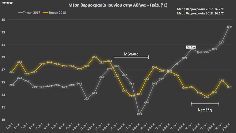 Με βάση τα στοιχεία που κατέγραψε ο μετεωρολογικός σταθμός του ΕΑΑ στο Γκάζι της Αθήνας, φέτος το πρώτο μισό του Ιουνίου ήταν κατά περίπου 3,5 βαθμούς θερμότερο από πέρυσι, αλλά το δεύτερο μισό του μήνα η μέση θερμοκρασία ήταν χαμηλότερη σε σχέση με πέρυσι.
