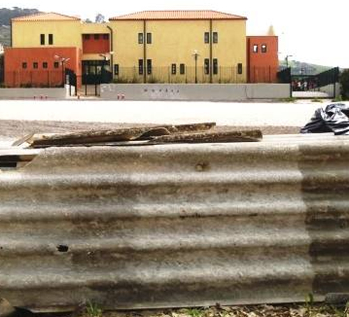 Δημόσιο κίνδυνο για την υγεία των μικρών μαθητών -και όχι μόνο- αποτελεί η ύπαρξη φύλλων αμιάντου-αμιαντοτσιμέντου (ΕΛΛΕΝΙΤ) απέναντι από την κεντρική είσοδο του 4ου Δημοτικού Σχολείου στο Λαγονήσι.