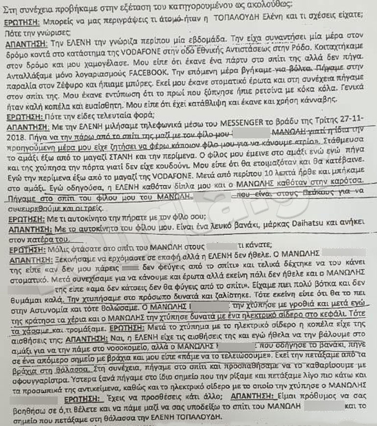 Αποτροπιασμό προκαλεί η κατάθεση του 19χρονου που κατηγορείται για τη δολοφονία της 21χρονης φοιτήτριας Ελένης Τοπαλούδη στη Ρόδο.