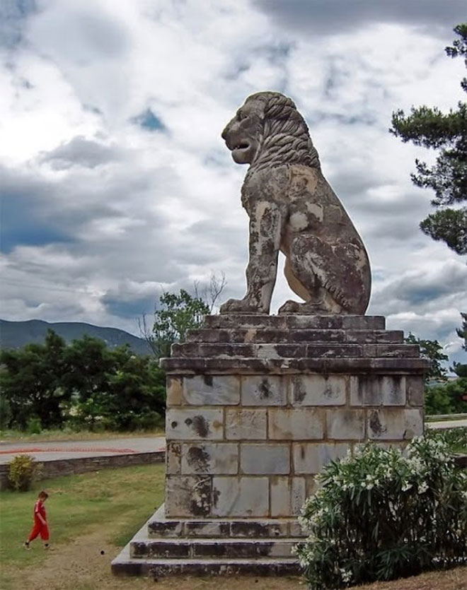 Αυτός είναι ο Λέοντας της Αμφίπολης που πιστεύεται ότι διακοσμούσε την κορυφή του υπό ανακάλυψη τάφου. Είναι ένα από τα σημαντικά μνημεία που διασώθηκαν και το μοναδικό που αναστηλώθηκε κοντά στην παλιά του θέση. Είναι ένα επιτάφιο μνημείο του 4ου αιώνα π.Χ. Πιθανόν ανήκει στον Λαομέδοντα, ναύαρχο και πιστό σύντροφο του Μεγάλου Αλεξάνδρου.