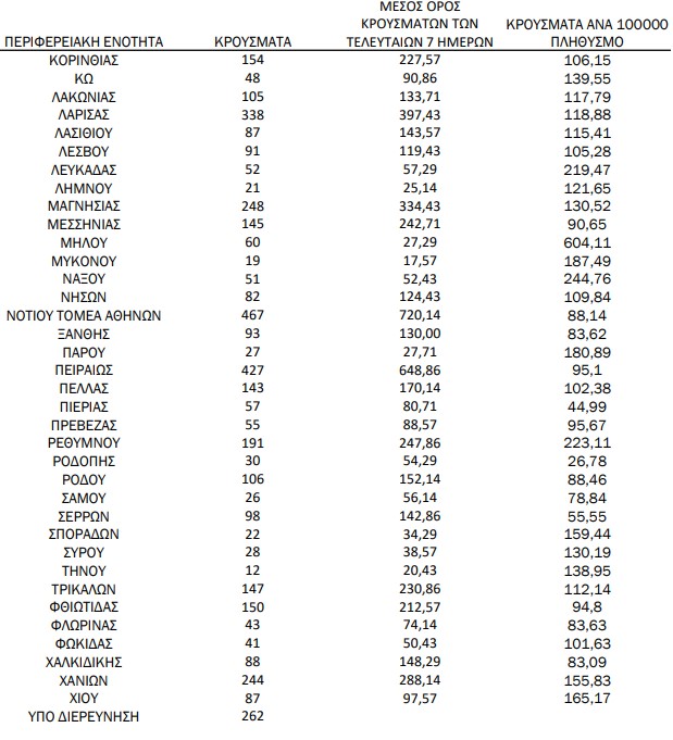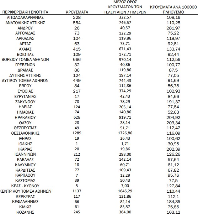 Υπενθυμίζεται πως τα περισσότερα σε αριθμό περιστατικά που είχε καταγράψει ο ΕΟΔΥ μέχρι σήμερα σε μία ημέρα ανακοινώθηκαν την Τρίτη 4 Ιανουαρίου 2022, όταν εντοπίστηκαν 50.126 περιπτώσεις σε ένα 24ωρο. Επίσης, ο μεγαλύτερος αριθμός θανάτων εξαιτίας του ιού σε ένα 24ωρο καταγράφηκε το Σάββατο 14 Δεκεμβρίου 2021, όταν έχασαν τη ζωή τους 130 ασθενείς.