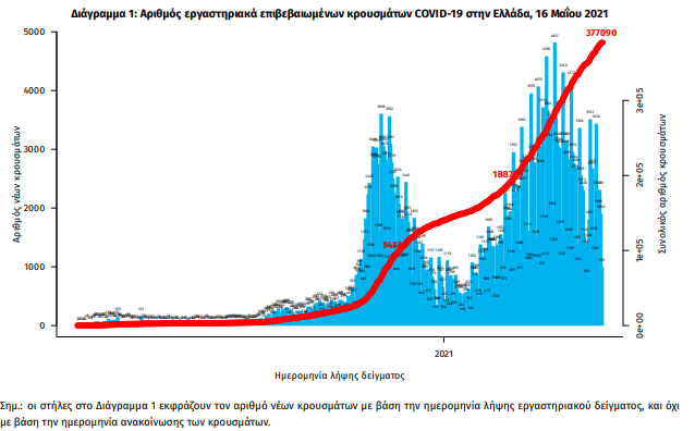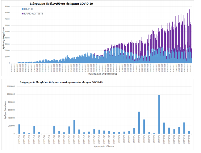 Δείγματα που έχουν ελεγχθεί: Από την 1η Ιανουαρίου 2020 μέχρι σήμερα, στα εργαστήρια που διενεργούν ελέγχους για τον νέο κορωνοϊό (SARS-CoV-2) και που δηλώνουν συστηματικά το σύνολο των δειγμάτων που ελέγχουν, έχουν συνολικά ελεγχθεί 4.873.517 κλινικά δείγματα ενώ από Μονάδες Υγείας και Κλιμάκια του ΕΟΔΥ που διενεργούν ελέγχους Rapid Ag έχουν ελεγχθεί 3.982.663 δείγματα. O μέσος όρος του επταημέρου είναι 55.375 δειγματοληπτικοί έλεγχοι. Αυτοδιαγνωστικοί έλεγχοι (Self-tests): Έως 15 Μαΐου 2021, έχουν καταγραφεί ηλεκτρονικά 5.331.757 δηλώσεις αποτελέσματος αυτοδιαγνωστικού ελέγχου, ενώ 141.516 άτομα προσήλθαν για επανέλεγχο. Mαζικές Δειγματοληψίες ΕΟΔΥ: Στις 15 Μαΐου 2021, πραγματοποιήθηκαν 29 δράσεις δειγματοληπτικών ελέγχων από τις Κινητές Ομάδες Υγείας (ΚΟΜΥ) του ΕΟΔΥ, στις οποίες διενεργήθηκαν 6.323 έλεγχοι Rapid Ag και ανευρέθηκαν 114 θετικά (1,8%).