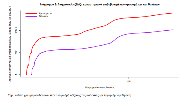 Η διαχρονική εξέλιξη των συνολικών κρουσμάτων και συνολικού αριθμού των θανάτων ασθενών COVID-19 παρουσιάζεται στο ακόλουθο διάγραμμα.