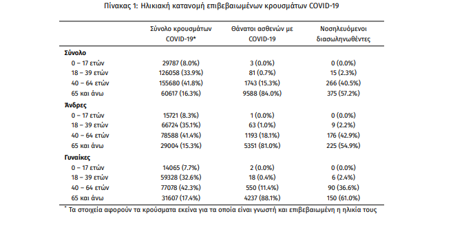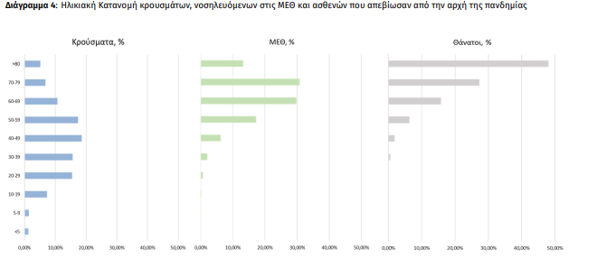 Ο αριθμός των ασθενών που νοσηλεύονται διασωληνωμένοι είναι 656 (62.5% άνδρες). Η διάμεση ηλικία τους είναι 67 έτη. To 82.5% έχει υποκείμενο νόσημα ή/και ηλικία 70 ετών και άνω. Από την αρχή της πανδημίας έχουν εξέλθει από τις ΜΕΘ 2.280 ασθενείς. Οι εισαγωγές2 νέων ασθενών Covid-19 στα νοσοκομεία της επικράτειας είναι 287 (ημερήσια μεταβολή -4.97%). Ο μέσος όρος εισαγωγών του επταημέρου είναι 323 ασθενείς.Η διάμεση ηλικία των κρουσμάτων είναι 44 έτη (εύρος 0.2 έως 106 έτη), ενώ η διάμεση ηλικία των θανόντων είναι 78 έτη (εύρος 0.2 έως 106 έτη).