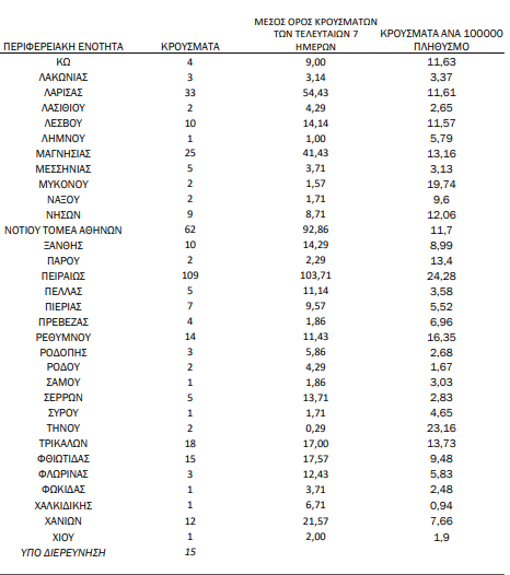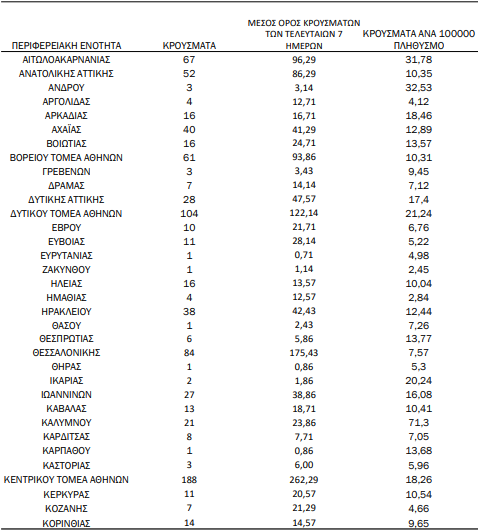 Κατανομή ανακοινωθέντων εγχώριων κρουσμάτων: Από το σύνολο των 1.262 νέων κρουσμάτων του νέου ιού στη χώρα 4 είναι εισαγόμενα εκ των οποίων 4 εντοπίστηκαν κατόπιν ελέγχων στις πύλες εισόδου της χώρας. Η κατανομή των 1.258 νέων εγχώριων κρουσμάτων ανά Περιφερειακή Ενότητα παρουσιάζεται στον κατωτέρω πίνακα.3