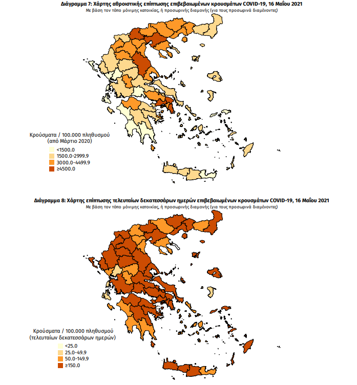 Πίνακας 2: Ημερήσιος αριθμός και κρούσματα ανά 100.000 πληθυσμού επιβεβαιωμένων εγχώριων κρουσμάτων COVID-19 ανά περιφερειακή ενότητα στις 16 Μαΐου 2021