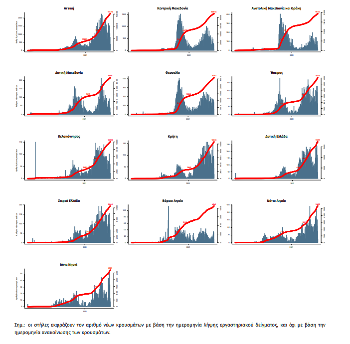 Παράρτημα 1: Επιδημικές καμπύλες κρουσμάτων COVID-19 με βάση την δηλωθείσα διεύθυνση μόνιμης κατοικίας του κρούσματος ή τη διεύθυνση προσωρινής διαμονής για τους τουρίστες και άλλους προσωρινά διαμένοντες στην Ελλάδα. Συμπεριλαμβάνονται τόσο κρούσματα με ιστορικό ταξιδίου όσο και κρούσματα με πιθανή εγχώρια μετάδοση.