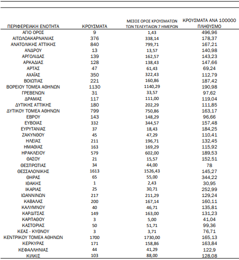 Υπενθυμίζεται πως τα περισσότερα σε αριθμό περιστατικά που είχε καταγράψει ο ΕΟΔΥ μέχρι σήμερα σε μία ημέρα ανακοινώθηκαν την Τρίτη 4 Ιανουαρίου 2022, όταν εντοπίστηκαν 50.126 περιπτώσεις σε ένα 24ωρο. Επίσης, ο μεγαλύτερος αριθμός θανάτων εξαιτίας του ιού σε ένα 24ωρο καταγράφηκε το Σάββατο 14 Δεκεμβρίου 2021, όταν έχασαν τη ζωή τους 130 ασθενείς.