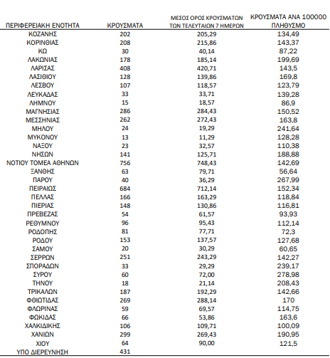 Υπενθυμίζεται πως τα περισσότερα σε αριθμό περιστατικά που είχε καταγράψει ο ΕΟΔΥ μέχρι σήμερα σε μία ημέρα ανακοινώθηκαν την Τρίτη 4 Ιανουαρίου 2022, όταν εντοπίστηκαν 50.126 περιπτώσεις σε ένα 24ωρο. Επίσης, ο μεγαλύτερος αριθμός θανάτων εξαιτίας του ιού σε ένα 24ωρο καταγράφηκε το Σάββατο 14 Δεκεμβρίου 2021, όταν έχασαν τη ζωή τους 130 ασθενείς.