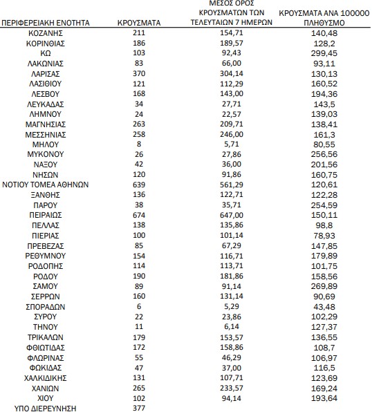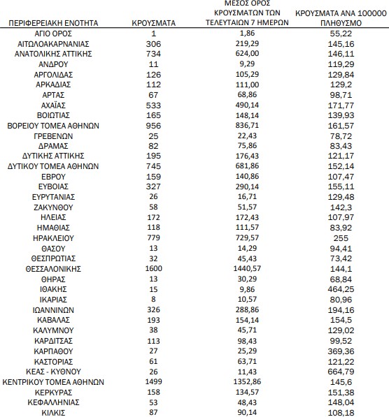 Υπενθυμίζεται πως τα περισσότερα σε αριθμό περιστατικά που είχε καταγράψει ο ΕΟΔΥ μέχρι σήμερα σε μία ημέρα ανακοινώθηκαν την Τρίτη 4 Ιανουαρίου 2022, όταν εντοπίστηκαν 50.126 περιπτώσεις σε ένα 24ωρο. Επίσης, ο μεγαλύτερος αριθμός θανάτων εξαιτίας του ιού σε ένα 24ωρο καταγράφηκε το Σάββατο 14 Δεκεμβρίου 2021, όταν έχασαν τη ζωή τους 130 ασθενείς.