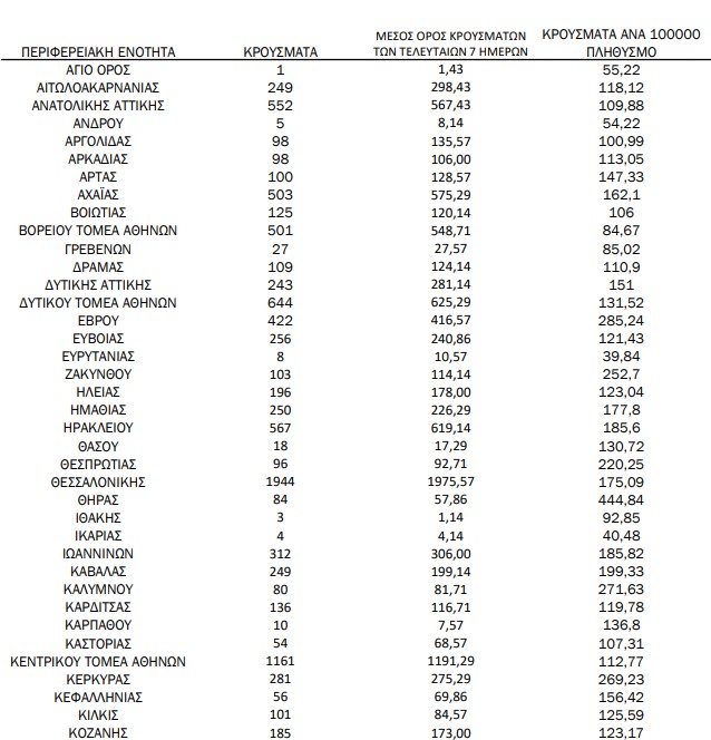 Υπενθυμίζεται πως τα περισσότερα σε αριθμό περιστατικά που είχε καταγράψει ο ΕΟΔΥ μέχρι σήμερα σε μία ημέρα ανακοινώθηκαν την Τρίτη 4 Ιανουαρίου 2022, όταν εντοπίστηκαν 50.126 περιπτώσεις σε ένα 24ωρο. Επίσης, ο μεγαλύτερος αριθμός θανάτων εξαιτίας του ιού σε ένα 24ωρο καταγράφηκε το Σάββατο 14 Δεκεμβρίου 2021, όταν έχασαν τη ζωή τους 130 ασθενείς.