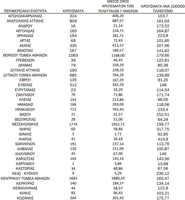 Υπενθυμίζεται πως τα περισσότερα σε αριθμό περιστατικά που είχε καταγράψει ο ΕΟΔΥ μέχρι σήμερα σε μία ημέρα ανακοινώθηκαν την Τρίτη 4 Ιανουαρίου 2022, όταν εντοπίστηκαν 50.126 περιπτώσεις σε ένα 24ωρο. Επίσης, ο μεγαλύτερος αριθμός θανάτων εξαιτίας του ιού σε ένα 24ωρο καταγράφηκε το Σάββατο 14 Δεκεμβρίου 2021, όταν έχασαν τη ζωή τους 130 ασθενείς.