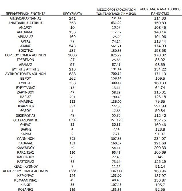 Υπενθυμίζεται πως τα περισσότερα σε αριθμό περιστατικά που είχε καταγράψει ο ΕΟΔΥ μέχρι σήμερα σε μία ημέρα ανακοινώθηκαν την Τρίτη 4 Ιανουαρίου 2022, όταν εντοπίστηκαν 50.126 περιπτώσεις σε ένα 24ωρο. Επίσης, ο μεγαλύτερος αριθμός θανάτων εξαιτίας του ιού σε ένα 24ωρο καταγράφηκε το Σάββατο 14 Δεκεμβρίου 2021, όταν έχασαν τη ζωή τους 130 ασθενείς.