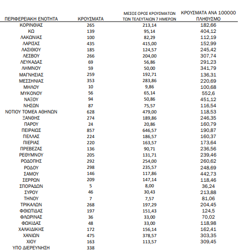 Υπενθυμίζεται πως τα περισσότερα σε αριθμό περιστατικά που είχε καταγράψει ο ΕΟΔΥ μέχρι σήμερα σε μία ημέρα ανακοινώθηκαν την Τρίτη 4 Ιανουαρίου 2022, όταν εντοπίστηκαν 50.126 περιπτώσεις σε ένα 24ωρο. Επίσης, ο μεγαλύτερος αριθμός θανάτων εξαιτίας του ιού σε ένα 24ωρο καταγράφηκε το Σάββατο 14 Δεκεμβρίου 2021, όταν έχασαν τη ζωή τους 130 ασθενείς.