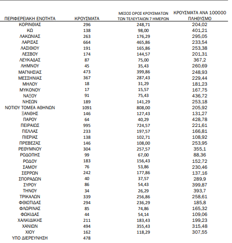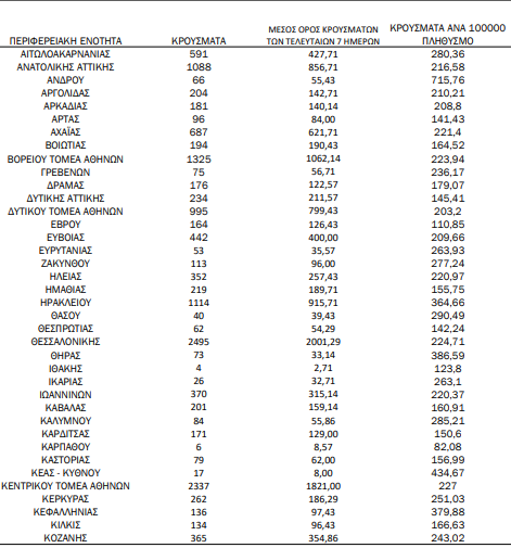 Υπενθυμίζεται πως τα περισσότερα σε αριθμό περιστατικά που είχε καταγράψει ο ΕΟΔΥ μέχρι σήμερα σε μία ημέρα ανακοινώθηκαν την Τρίτη 4 Ιανουαρίου 2022, όταν εντοπίστηκαν 50.126 περιπτώσεις σε ένα 24ωρο. Επίσης, ο μεγαλύτερος αριθμός θανάτων εξαιτίας του ιού σε ένα 24ωρο καταγράφηκε το Σάββατο 14 Δεκεμβρίου 2021, όταν έχασαν τη ζωή τους 130 ασθενείς.