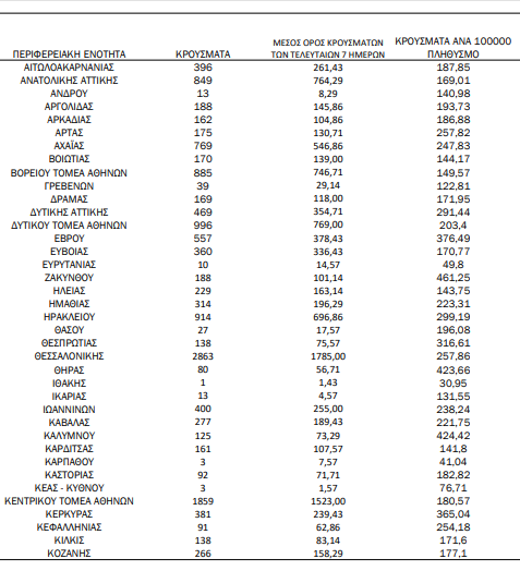 Υπενθυμίζεται πως τα περισσότερα σε αριθμό περιστατικά που είχε καταγράψει ο ΕΟΔΥ μέχρι σήμερα σε μία ημέρα ανακοινώθηκαν την Τρίτη 4 Ιανουαρίου 2022, όταν εντοπίστηκαν 50.126 περιπτώσεις σε ένα 24ωρο. Επίσης, ο μεγαλύτερος αριθμός θανάτων εξαιτίας του ιού σε ένα 24ωρο καταγράφηκε το Σάββατο 14 Δεκεμβρίου 2021, όταν έχασαν τη ζωή τους 130 ασθενείς.