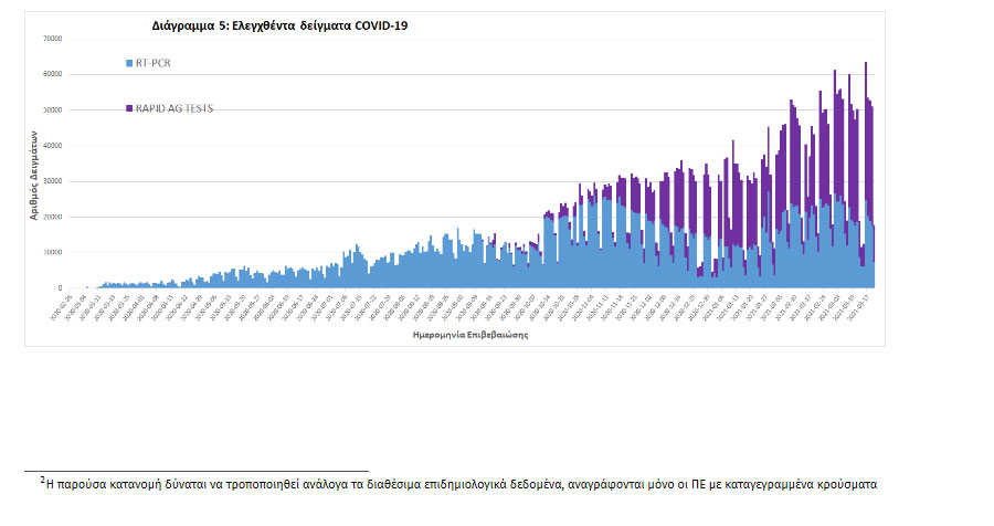 Δείγματα που έχουν ελεγχθεί: Από την 1η Ιανουαρίου 2020 μέχρι σήμερα, στα εργαστήρια που διενεργούν ελέγχους για τον νέο κορωνοϊό (SARS-CoV-2) και που δηλώνουν συστηματικά το σύνολο των δειγμάτων που ελέγχουν, έχουν συνολικά ελεγχθεί 4.020.586κλινικά δείγματα ενώ από Μονάδες Υγείας και Κλιμάκια του ΕΟΔΥ που διενεργούν ελέγχους Rapid Ag έχουν ελεγχθεί 2.099.431 δείγματα. O μέσος όρος του επταημέρου είναι 37.628 δειγματοληπτικοί έλεγχοι.