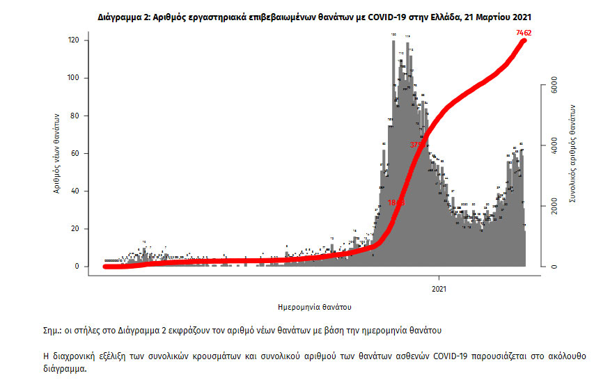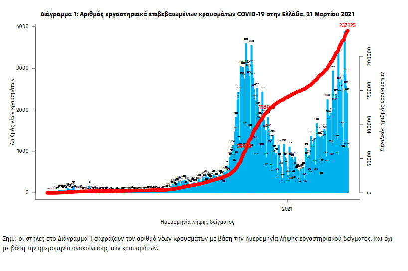Τα στοιχεία που παρουσιάζονται αφορούν περιστατικά από την επιδημιολογική επιτήρηση της νόσου από το νέο κορωνοϊό (COVID-19), με βάση τα δεδομένα που έχουν δηλωθεί στον ΕΟΔΥ και καταγραφεί μέχρι τις 21 Μαρτίου 2021 (ώρα 15:00).Τα νέα εργαστηριακά επιβεβαιωμένα κρούσματα της νόσου που καταγράφηκαν τις τελευταίες 24 ώρες είναι 1.514, εκ των οποίων9εντοπίστηκαν κατόπιν ελέγχων στις πύλες εισόδου της χώρας. Ο συνολικός αριθμός των κρουσμάτων ανέρχεται σε 237.125 (ημερήσια μεταβολή +0.6%), εκ των οποίων 51.5% άνδρες. Με βάση τα επιβεβαιωμένα κρούσματα των τελευταίων 7 ημερών, 68θεωρούνται σχετιζόμενα με ταξίδι από το εξωτερικό και 2.757 είναι σχετιζόμενα με ήδη γνωστό κρούσμα. Ημερήσια εξέλιξη της πανδημίας: Η ημερήσια κατανομή των επιβεβαιωμένων κρουσμάτων είναι η ακόλουθη (η γραμμή παριστάνει την συνολική, αθροιστική κατανομή των κρουσμάτων).