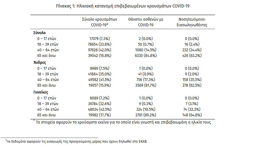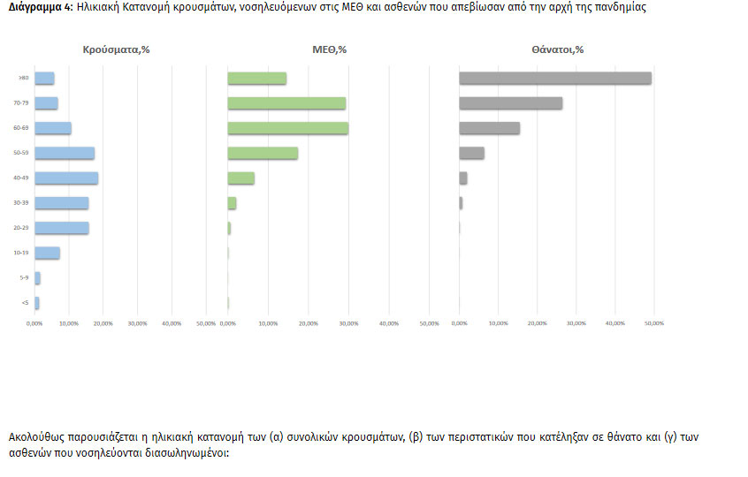 Ο αριθμός των ασθενών που νοσηλεύονται διασωληνωμένοι είναι 674 (65.9% άνδρες). Η διάμεση ηλικία τους είναι 68 έτη. To 81.0% έχει υποκείμενο νόσημα ή/και ηλικία 70 ετών και άνω. Από την αρχή της πανδημίας έχουν εξέλθει από τις ΜΕΘ 1.577 ασθενείς. Οι εισαγωγές νέων ασθενών Covid-19 στα νοσοκομεία της επικράτειας είναι 512 (ημερήσια μεταβολή-0.19%). Ο μέσος όρος εισαγωγών του επταημέρου είναι 481 ασθενείς. Η διάμεση ηλικία των κρουσμάτων είναι 44 έτη (εύρος 0.2 έως 105 έτη), ενώ η διάμεση ηλικία των θανόντων είναι79 έτη (εύρος 0 έως103 έτη).