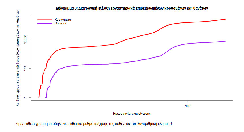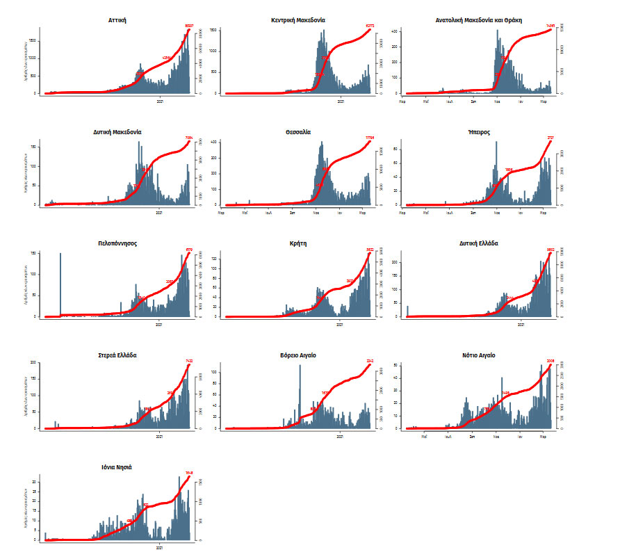 Σημ.: οι στήλες εκφράζουν τον αριθμό νέων κρουσμάτων με βάση την ημερομηνία λήψης εργαστηριακού δείγματος, και όχι με βάση την ημερομηνία ανακοίνωσης των κρουσμάτων.